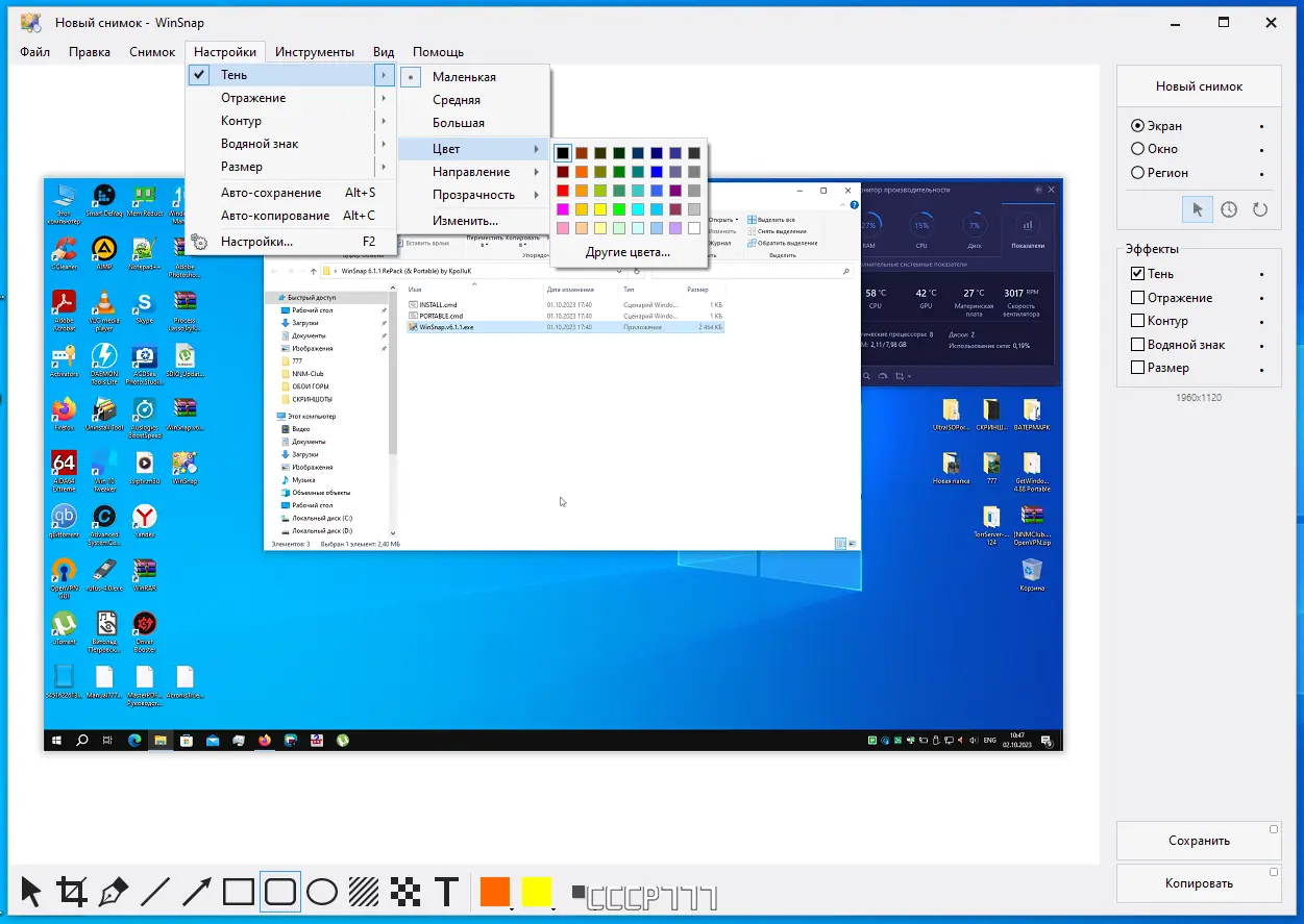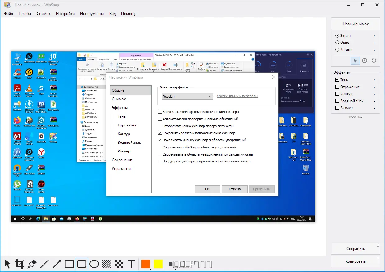 Использование WinSnap не требует специальных навыков. После запуска приложение добавляется в область уведомлений, где доступны все основные функции. Съёмка выполняется через контекстное меню или с помощью назначенных сочетаний клавиш. Перед съёмкой можно выбрать тип захвата — активное окно, область, весь экран или прозрачный объект. После создания скриншота открывается встроенный редактор для обработки изображения.