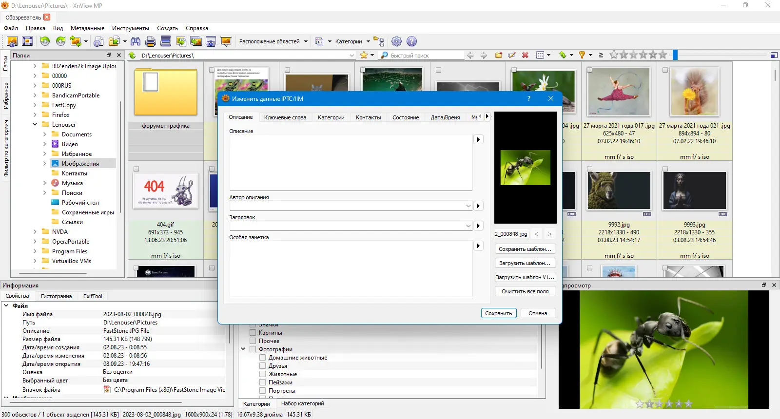 - Встроенный инструмент для редактирования EXIF и IPTC-тегов, что полезно для фотографов и архивистов.