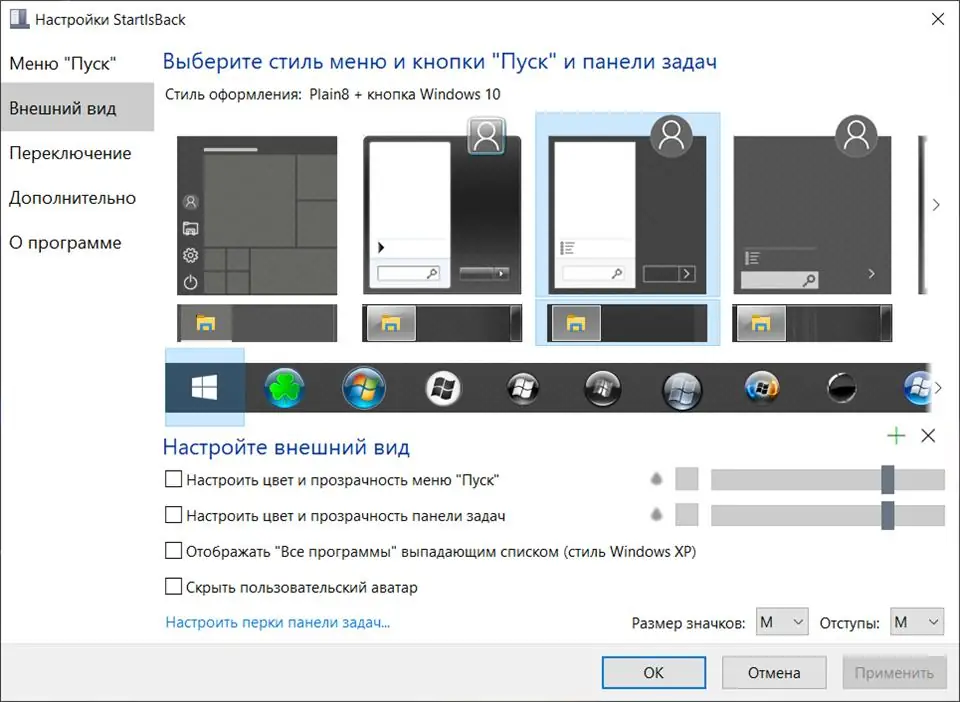 - Гибкие настройки внешнего вида: изменение иконки кнопки, цветовой схемы, прозрачности и стиля панели задач.