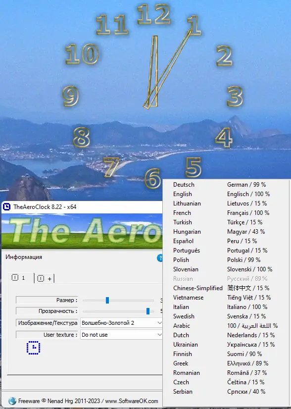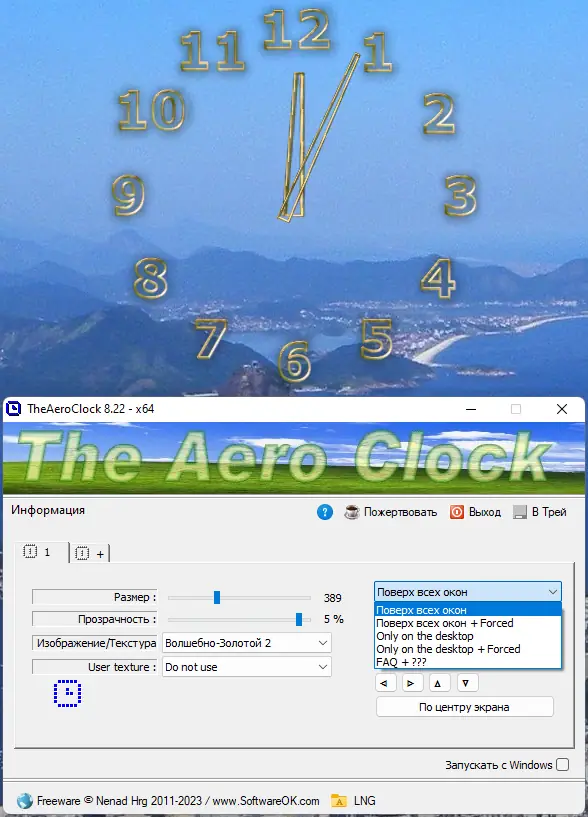 - Поддержка полной прозрачности до 100%, что позволяет интегрировать часы в любой фон рабочего стола