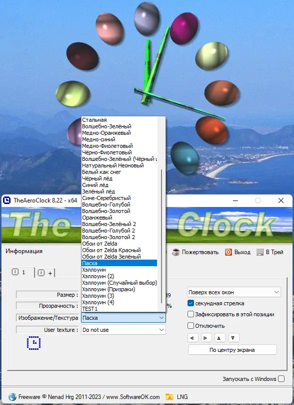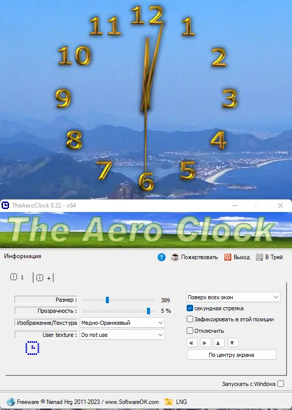 TheAeroClock — это легковесное приложение, устанавливающее на рабочий стол стильные часы с эффектом прозрачности и широкими возможностями настройки внешнего вида. Программа не требует установки, поддерживает запуск вместе с системой и может отображаться поверх всех окон. Идеальное решение для пользователей, ценящих как функциональность, так и визуальную эстетику рабочего пространства.