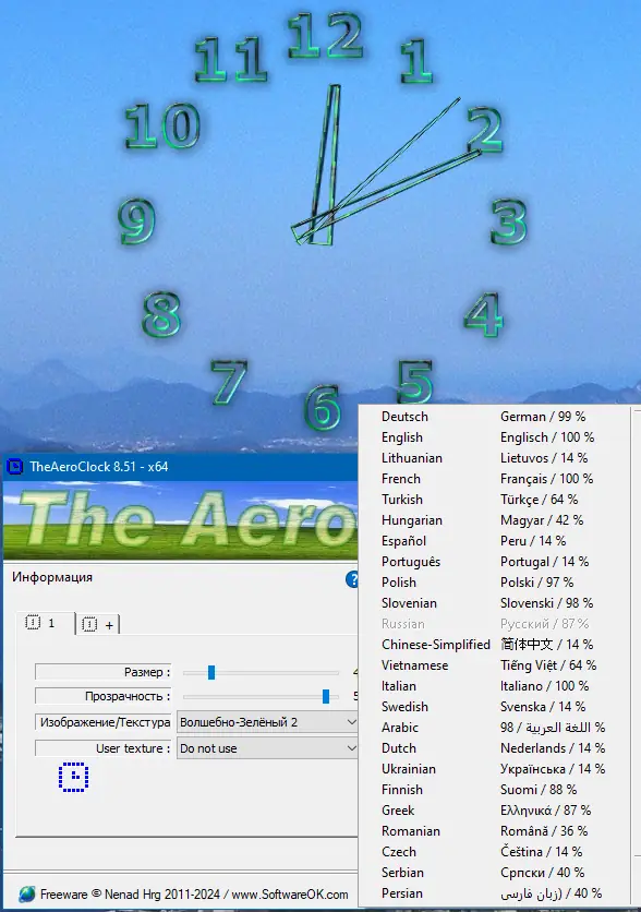 TheAeroClock представляет собой легковесный виджет, разработанный для пользователей, которым важна как функциональность, так и визуальная эстетика. Приложение интегрируется в интерфейс Windows, не нагружая систему, и позволяет настроить отображение времени под индивидуальные предпочтения. Благодаря поддержке прозрачности, изменению размеров и выбору текстур, часы органично вписываются в любой стиль оформления рабочего стола.