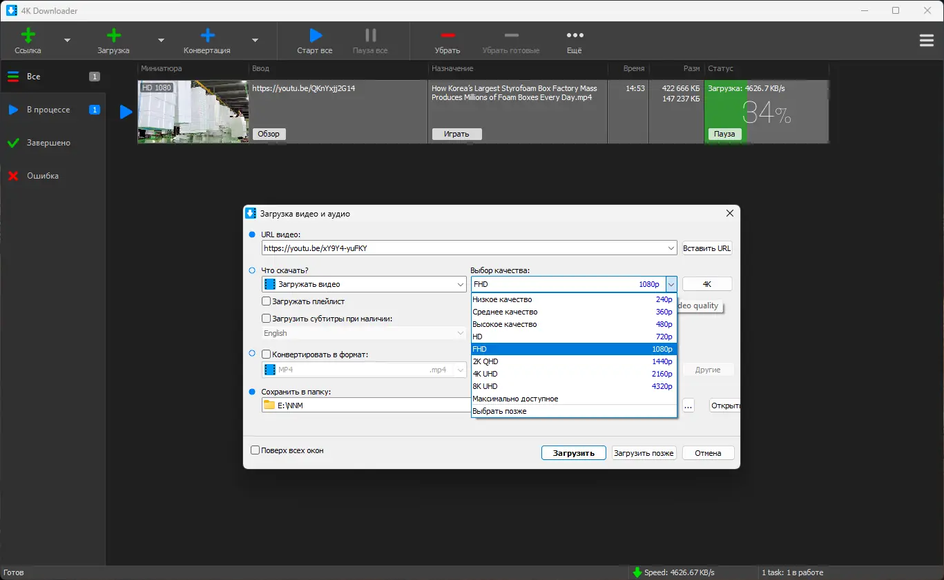 Использование приложения начинается с копирования ссылки на нужное видео или плейлист. После этого 4K Downloader автоматически распознаёт URL и предлагает выбрать качество, формат и папку для сохранения. Пользователь может указать, требуется ли только аудиодорожка, или необходимо сохранить видео в максимальном доступном разрешении. Загрузки можно добавлять в очередь, что позволяет управлять несколькими задачами одновременно. После завершения процесса файл становится доступен для просмотра без подключения к интернету.