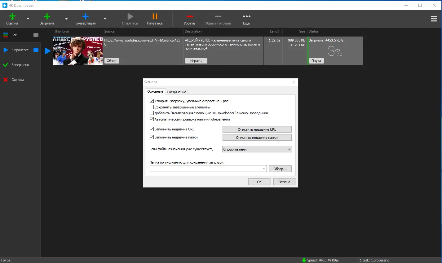 Приложение интегрируется с буфером обмена и запускает процесс загрузки сразу после копирования ссылки, что экономит время и упрощает работу.