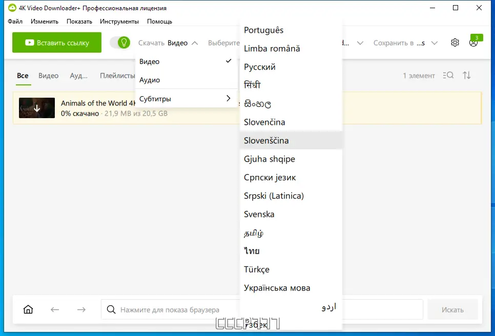 4K Video Downloader — это мощный инструмент для сохранения мультимедиа с веб-ресурсов напрямую на устройство пользователя. Программа поддерживает широкий спектр платформ, включая YouTube, Vimeo, SoundCloud, Facebook и другие. Пользователи могут выбирать форматы вывода, такие как MP4, MKV, M4A, MP3, а также загружать субтитры и аннотации.