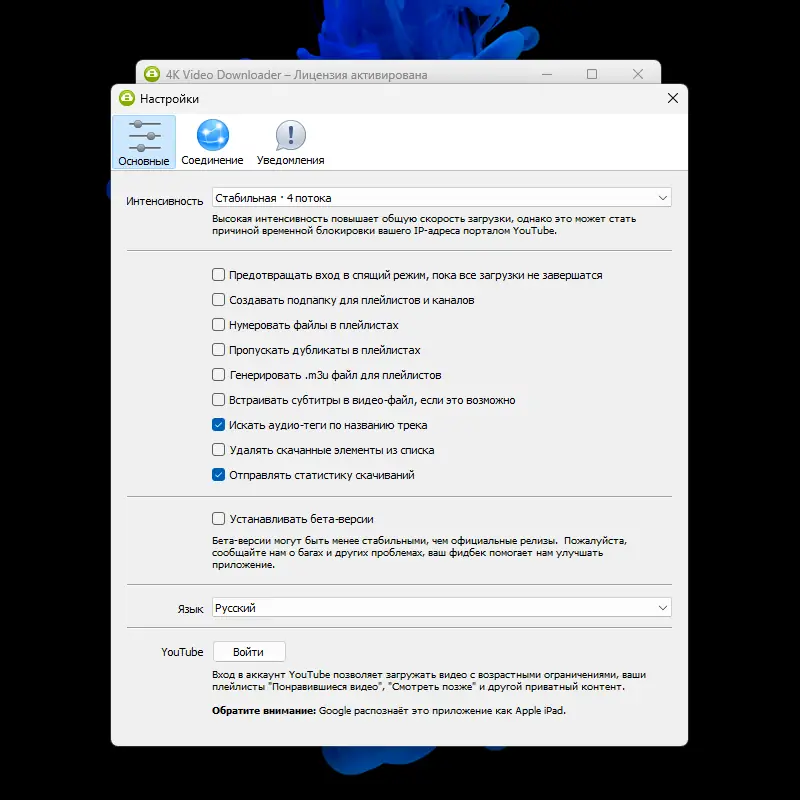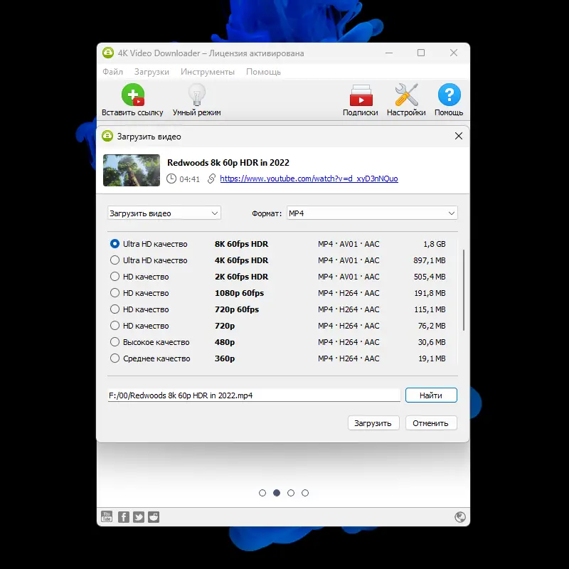 Программа поддерживает умный режим, который автоматизирует процесс выбора формата и качества при вставке ссылки.