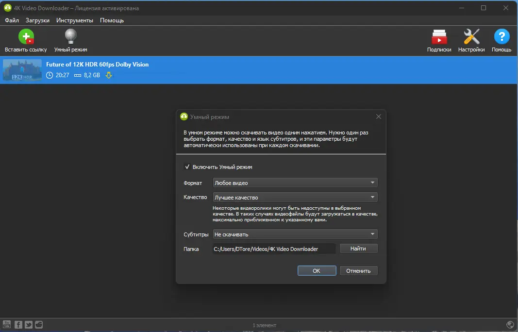 Использование приложения не требует технических знаний. Достаточно скопировать ссылку на видео из браузера и вставить её в окно программы через кнопку «Вставить ссылку». Далее выбирается желаемое качество, формат и папка для сохранения. После запуска загрузки файлы обрабатываются и сохраняются локально. Включённый умный режим позволяет автоматизировать выбор параметров для будущих закачек.