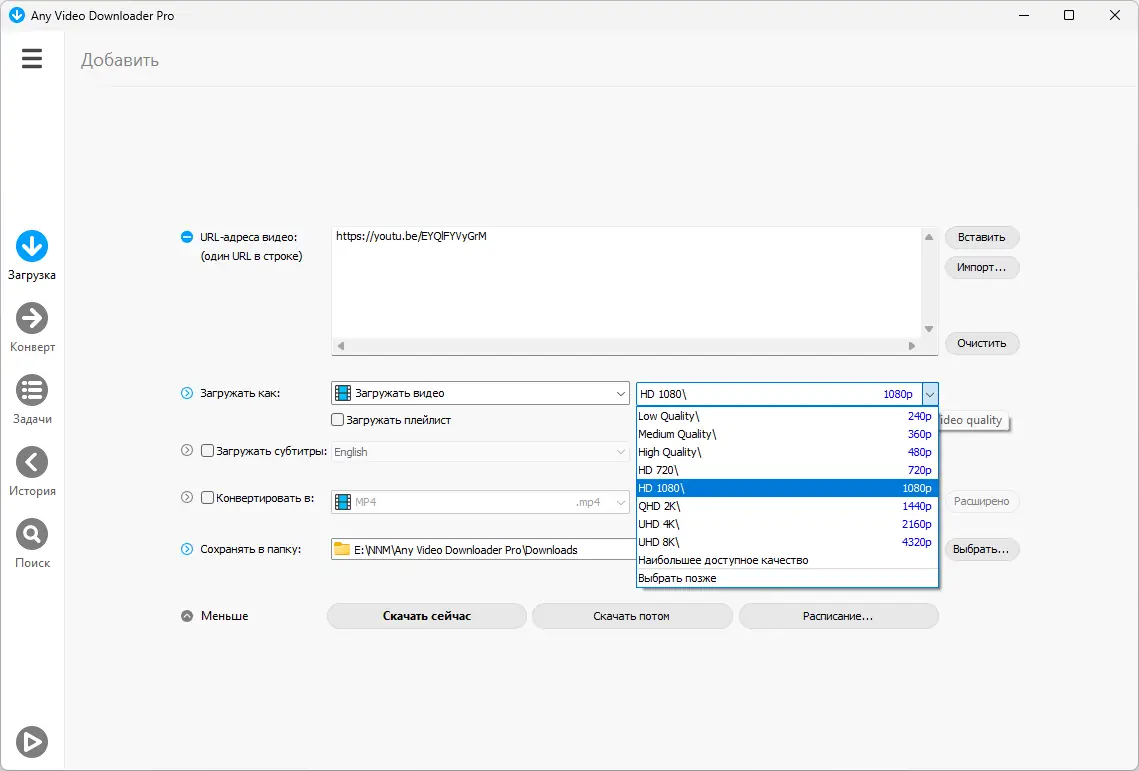 Any Video Downloader — это мощное приложение для загрузки видео с популярных платформ, включая YouTube, Facebook и Dailymotion. Программа поддерживает высокие разрешения, включая 4K и 8K, а также позволяет конвертировать контент в различные форматы для просмотра на разных устройствах. Благодаря встроенному ускорителю загрузки, процесс передачи данных становится в разы быстрее.