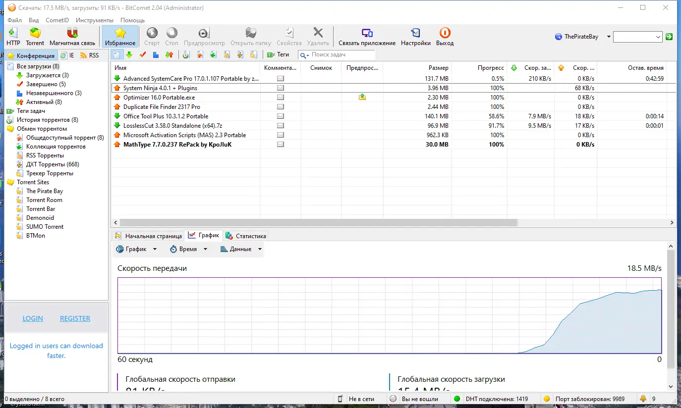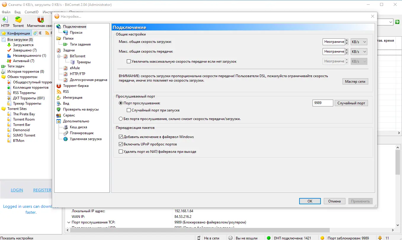 BitComet эффективно справляется с управлением сетевым трафиком, снижая отдачу при падении скорости загрузки, что особенно важно при ограниченном канале.