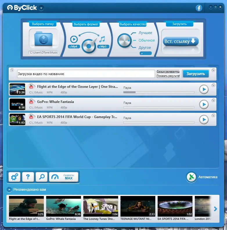Использование ByClick Downloader не требует специальных навыков. Достаточно скопировать URL нужного видео, вставить его в поле программы, выбрать желаемый формат и качество, указать папку для сохранения и нажать кнопку «Вставить URL». Загрузка начнётся автоматически. Для скачивания плейлиста или целого канала достаточно вставить ссылку на него — программа определит все доступные видео и предложит начать массовую загрузку. Дополнительно поддерживается экспорт в iTunes и автокопирование настроек между установками.