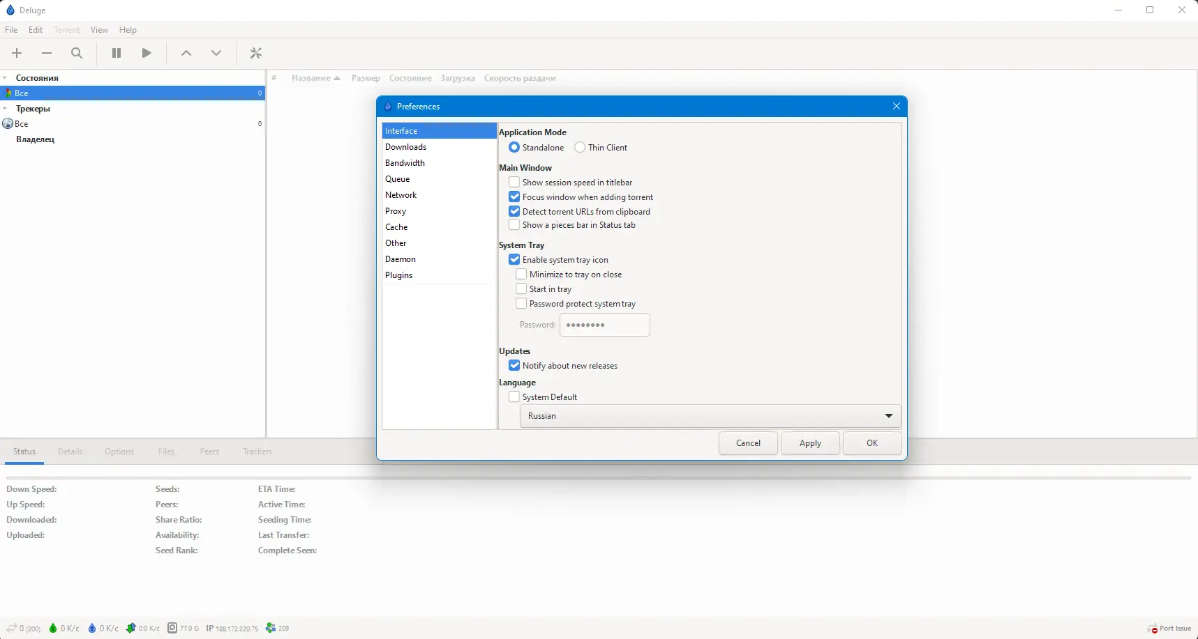 Deluge работает как в автономном режиме, так и по принципу клиент-сервер, что делает его удобным для использования на домашних и удалённых машинах.