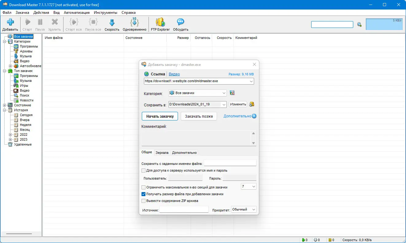 Download Master — это высокопроизводительный менеджер загрузок, разработанный для ускорения закачки файлов из интернета, восстановления прерванных соединений и удобного управления загруженным контентом. Программа поддерживает протоколы HTTP, HTTPS и FTP, обеспечивая стабильную и быструю передачу данных даже при нестабильном соединении. Благодаря многопоточной технологии и интуитивному интерфейсу, она подходит как для повседневного использования, так и для профессиональных задач, связанных с массовым скачиванием.