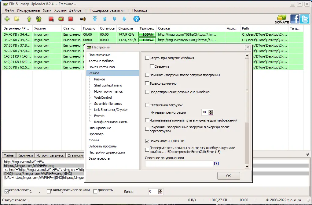 - Возможность одновременной загрузки до восьми файлов на разные серверы