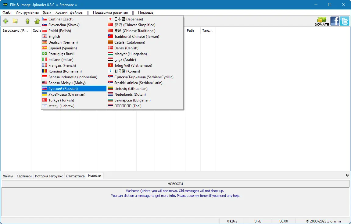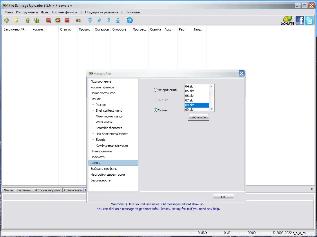 Интерфейс программы интуитивно понятен и не требует глубоких технических знаний. После запуска можно сразу добавлять файлы через кнопку загрузки или перетаскиванием. В окне выбора сервера указывается нужный хостинг, после чего начинается передача. Для смены языка достаточно перейти в меню и выбрать предпочитаемый вариант из списка. Темы оформления меняются в настройках, где доступен выбор скинов — визуальные изменения применяются мгновенно. Также можно настроить лимиты скорости, чтобы не перегружать канал интернета.
