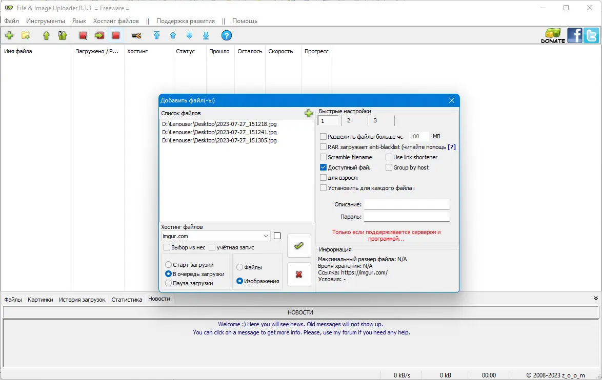 File & Image Uploader — это инструмент для быстрой и одновременной загрузки файлов, изображений и видео на более чем 250 популярных файлообменников и облачных сервисов. Программа поддерживает работу с премиум-аккаунтами, прокси-серверами, позволяет ограничивать скорость передачи и загружать несколько файлов параллельно. Подходит как для обычных пользователей, так и для тех, кто регулярно работает с большими объёмами данных в интернете.