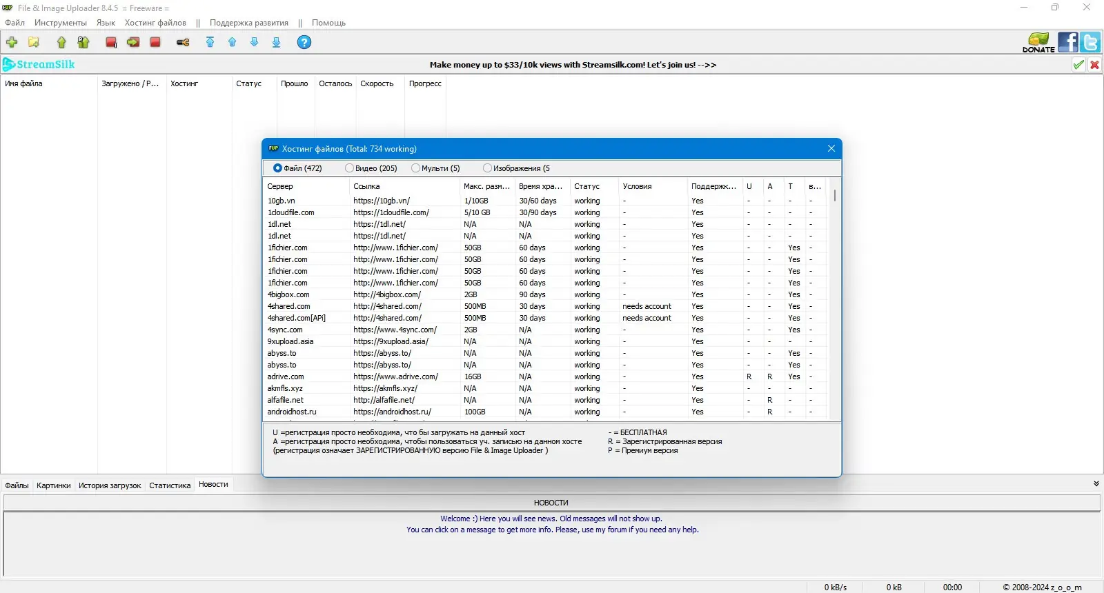 File & Image Uploader доступна для бесплатного скачивания и подходит для пользователей, которым необходимо регулярно размещать медиафайлы, документы или архивы в сети. Версия Freeware полностью функциональна, но при превышении суточного лимита некоторые возможности временно блокируются. Поддержка разработчика активна, и по запросам пользователей добавляются новые серверы и функции. Программа регулярно обновляется, в последнем релизе добавлена поддержка таких сервисов, как infidrive.net, streamsilk.com, goodstream.uno, bunkrr.su и улучшена работа с gofile.io, включая загрузку в указанную папку.
