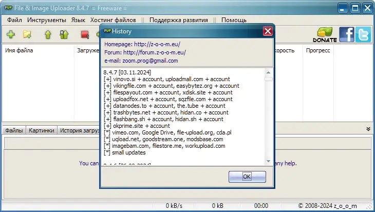 File & Image Uploader — портативное приложение для быстрой загрузки файлов, изображений и видео на более чем 250 популярных файловых хостингов. Программа поддерживает премиум-аккаунты, прокси-серверы, параллельную передачу данных и контроль скорости. Подходит для пользователей, активно работающих с облачными хранилищами и файлообменниками.