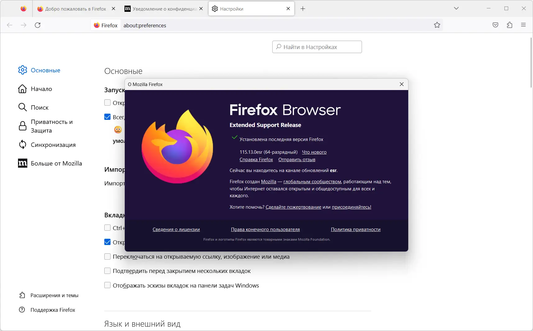 Mozilla Firefox — это современный веб-браузер с открытым исходным кодом, разработанный фондом Mozilla. Он сочетает в себе высокую скорость, надежную защиту данных и гибкость настройки под нужды пользователя. Программа поддерживает множество функций, включая блокировку рекламы, работу с вкладками, расширения и инструменты для разработчиков. Версия esr предназначена для организаций, которым требуется стабильность и длительная поддержка без частых обновлений интерфейса.
