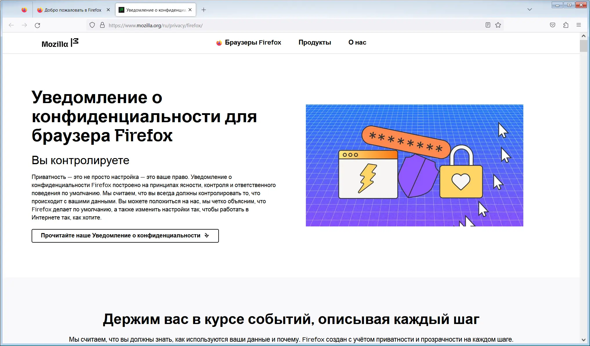 Firefox предлагает продвинутые функции конфиденциальности, включая режим приватного просмотра с защитой от отслеживания.