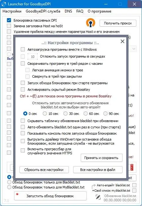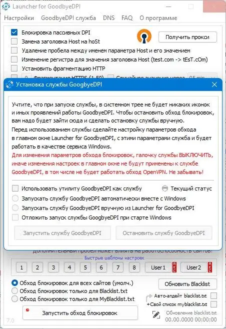 Для начала работы необходимо запустить лаунчер от имени администратора, выбрав версию, соответствующую разрядности системы — x86 или x64. После запуска рекомендуется начать с быстрых настроек, которые подбирают оптимальные параметры автоматически. Если после включения определённые сайты перестали открываться, следует отключать функции по одной, чтобы выявить конфликтующий параметр. В случае, если программа не работает корректно, можно выполнить сброс настроек через меню или запустить файл с ключом /reset. Для постоянного использования доступна установка в автозагрузку и режим службы, при котором интерфейс не отображается, а обход DPI работает незаметно. Дополнительно предусмотрена возможность редактирования пользовательского черного списка myblacklist.txt, который сохраняется при обновлении основного файла блокировок.