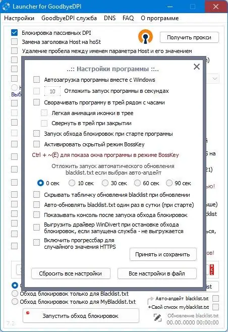 Для запуска необходимо выбрать версию, соответствующую разрядности системы — x86 или x64 — и запустить лаунчер от имени администратора. После этого можно воспользоваться быстрыми настройками, подобранными для типичных сценариев, или перейти к ручной конфигурации. При необходимости программа может быть установлена как служба Windows, что позволяет ей работать в фоне без отображения окон. Обновление черного списка выполняется вручную или по расписанию, а пользовательские домены можно добавлять через файл myblacklist.txt, который не перезаписывается при обновлении основного списка. В случае, если после настройки что-то перестал открываться, рекомендуется отключать параметры по одному для выявления конфликтующего режима.