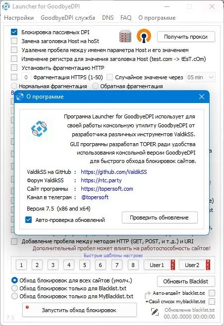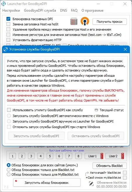 Программа доступна для установки на современных версиях Windows, включая 7, 8.1, 10 и 11. Процесс установки прост: достаточно запустить лаунчер, выбрать подходящие параметры и активировать защиту. В случае проблем с антивирусом, особенно с Защитником Windows, рекомендуется добавить файлы в исключения — возможен ложный срабатывание на компоненты, связанные с перехватом трафика. Поддержка пользователей реализована через встроенный FAQ и внешние ресурсы, включая тематические форумы и репозиторий на github. Для пользователей, которым нужен расширенный контроль, предусмотрена возможность запуска как службы, что позволяет избежать появления окон и иконок в трее. Утилита продолжает развиваться, и версия 2 уже включает улучшенные алгоритмы обхода, а также интеграцию с новыми источниками данных.