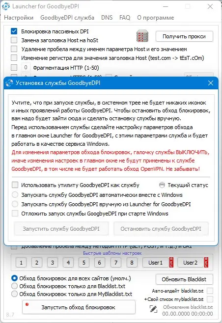 - Гибкая настройка через графический интерфейс Launcher for GoodbyeDPI