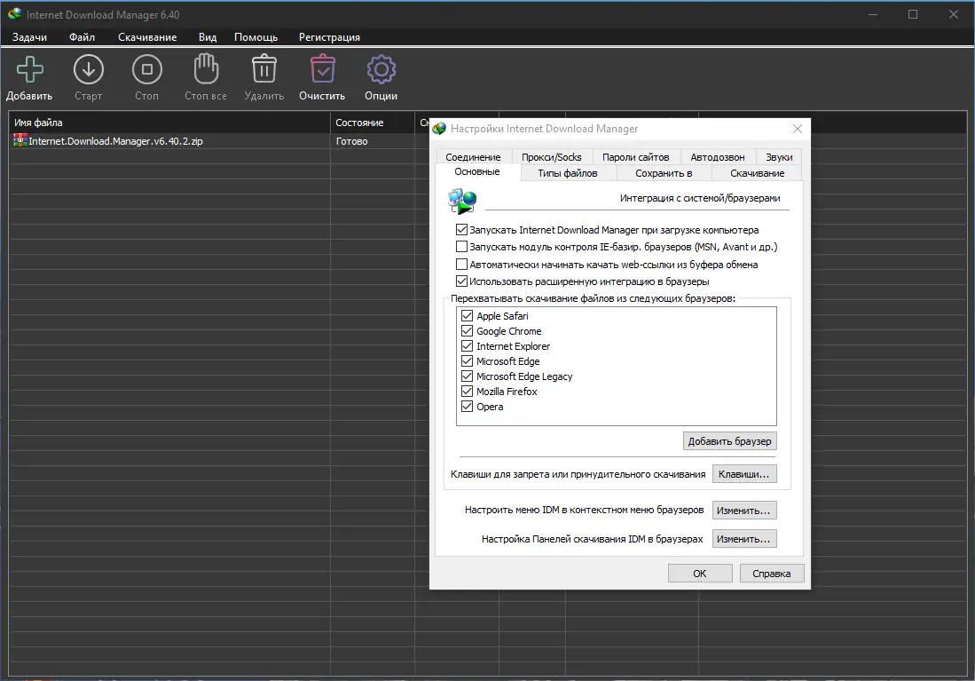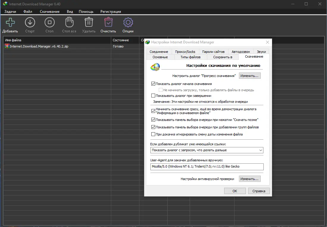 После установки и интеграции в браузер, Internet Download Manager начинает автоматически отслеживать все загружаемые файлы. При переходе по ссылке на аудио, видео или архив, появляется всплывающее окно программы с предложением взять закачку в управление. Пользователь может выбрать папку назначения, приоритет задачи и добавить задание в очередь. Для ручного запуска загрузки предусмотрена кнопка «Добавить ссылку», где можно вставить URL вручную. Настройки позволяют регулировать количество соединений, таймауты и поведение при завершении задач.