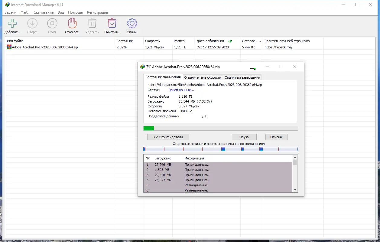 Internet Download Manager — программа для ускорения загрузки файлов из интернета с поддержкой докачки, расписания и интеграции в браузеры. Инструмент эффективно использует доступный канал, разбивая файлы на сегменты и загружая их параллельно. Работает с различными протоколами, включая HTTP, HTTPS и FTP, обеспечивая стабильность и высокую скорость.