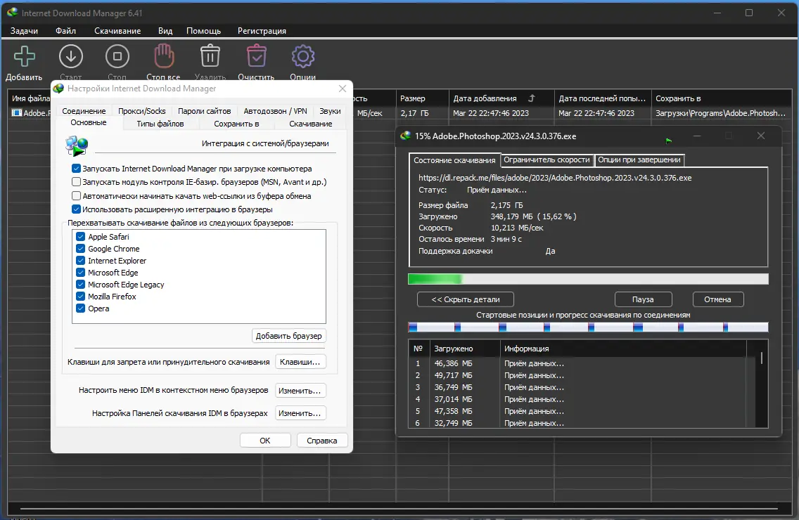 Internet Download Manager — это мощное приложение, разработанное для оптимизации процесса загрузки данных из сети. Программа поддерживает интеллектуеное управление соединением, использует динамическую сегментацию и многопоточную загрузку, что значительно увеличивает скорость передачи. Благодаря встроенному логическому ускорителю, файлы разбиваются на части, которые загружаются параллельно, что особенно полезно при нестабильном соединении. Поддерживаются различные протоколы, включая HTTP, HTTPS и FTP, а также возможность работы с прокси-серверами и авторизацией.