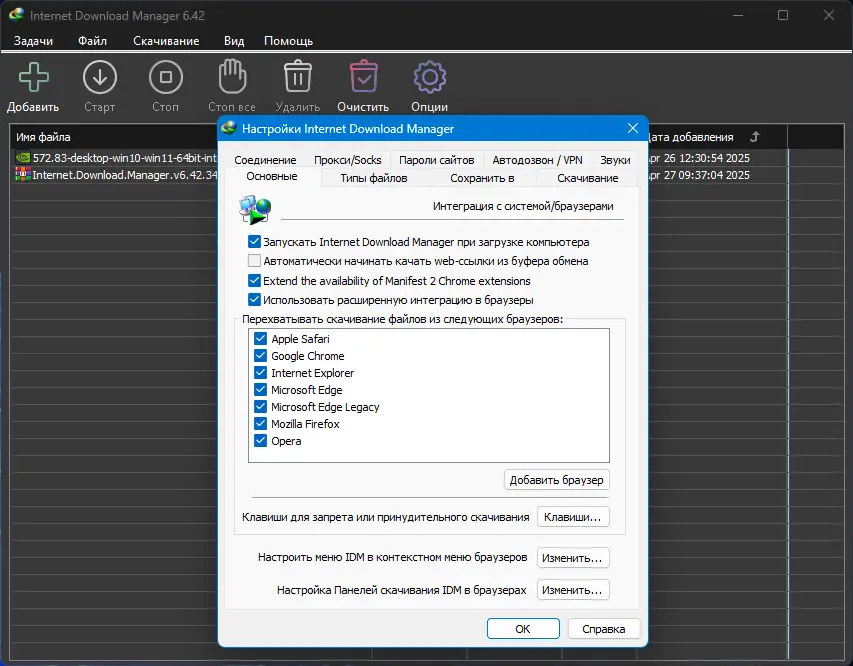 После установки программа автоматически настраивается и интегрируется в браузеры, начиная перехватывать загружаемые файлы. При переходе по ссылке на видео, музыку или архив появляется панель уведомления, позволяющая запустить закачку через IDM. Пользователь может вручную указать путь сохранения, расписание или приоритет задачи. В настройках доступно управление прокси, фильтрация типов файлов и выбор количества соединений, что особенно полезно при использовании медленных каналов.