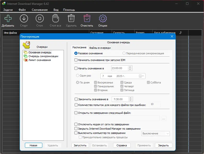 - Гибкое расписание для старта и остановки закачек в указанное время.