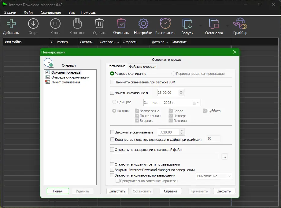 - Гибкое расписание, позволяющее запускать и приостанавливать закачку в заданное время.