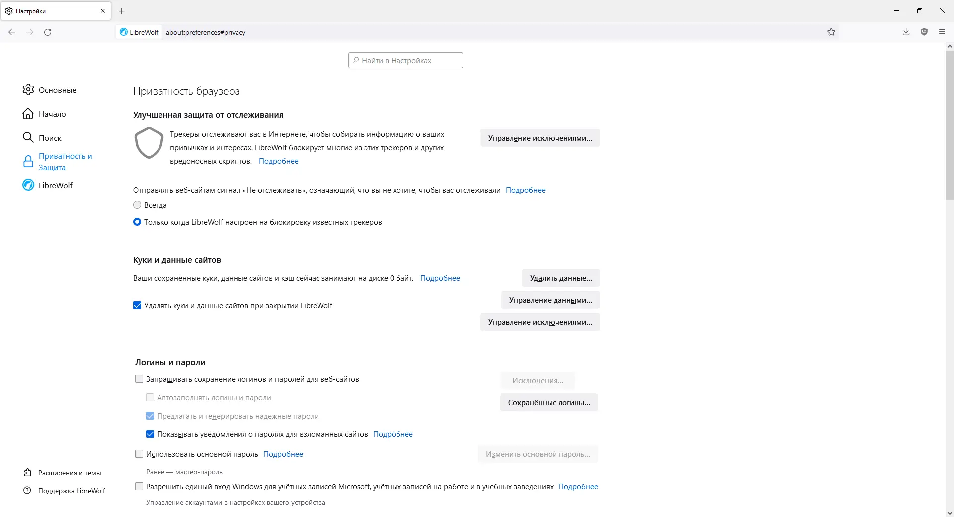 LibreWolf создан на основе исходного кода Firefox, но с существенными изменениями, направленными на устранение всех элементов, связанных со сбором данных. Этот браузер удаляет встроенную телеметрию Mozilla, отключает облачную синхронизацию через учётную запись Firefox и исключает любые формы спонсируемого контента. Интерфейс очищен от ненужных кнопок, таких как «Сохранить в Pocket», а главная страница не содержит рекомендаций или рекламных материалов.