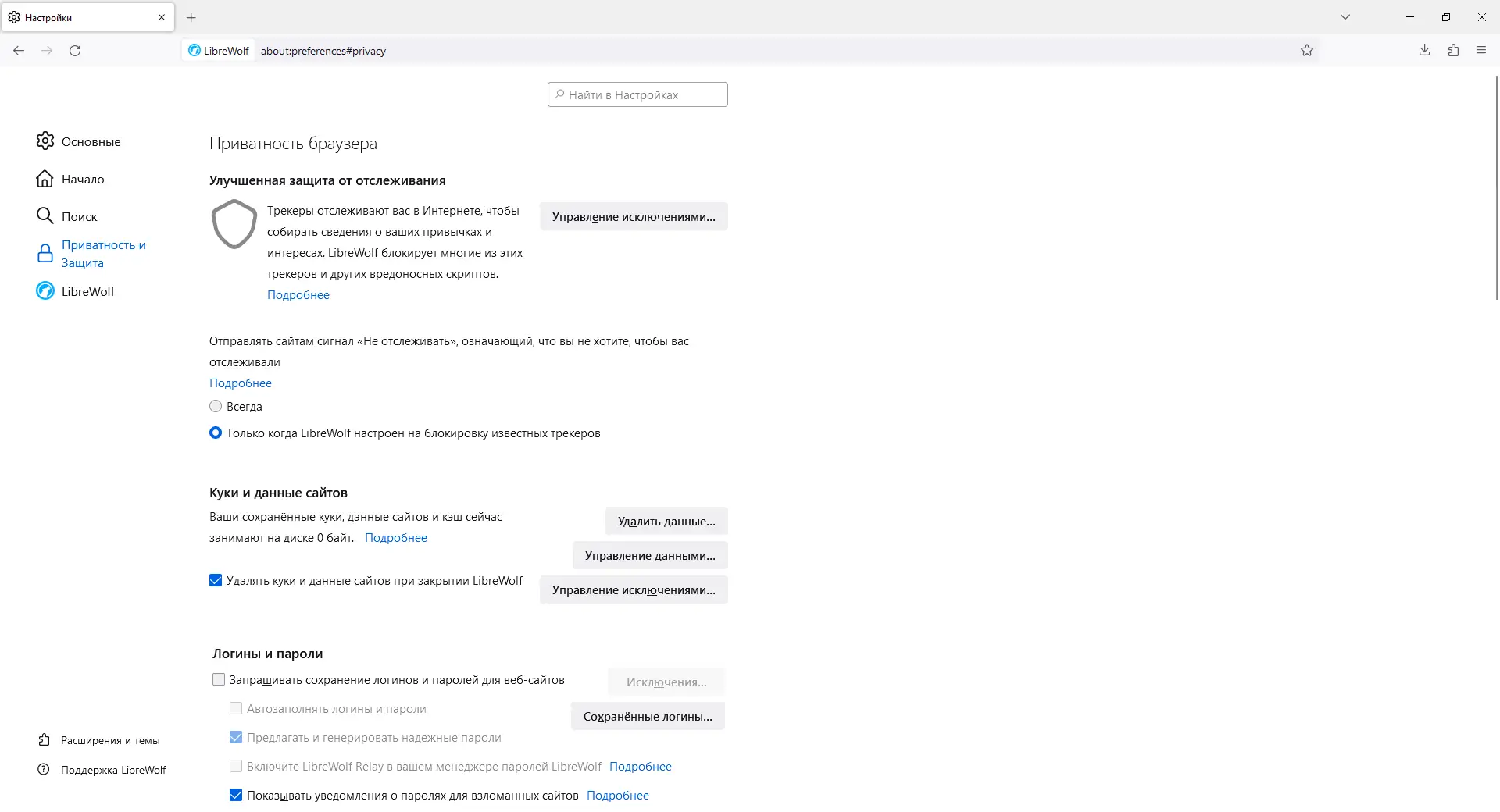 LibreWolf — это форк браузера Firefox, ориентированный на максимальную приватность и безопасность. Он поставляется с предварительно настроенными параметрами защиты, блокировкой телеметрии и отслеживания, а также включёнными инструментами для анонимного серфинга. Программа подходит тем, кто ищет альтернативу стандартным браузерам с акцентом на конфиденциальность.