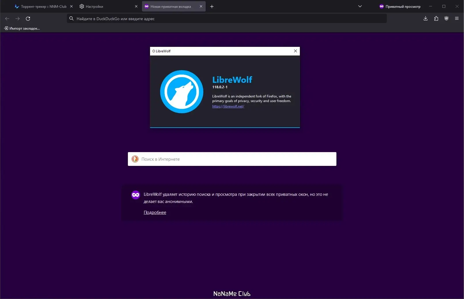 LibreWolf — это форк браузера Firefox, ориентированный на максимальную приватность и безопасность пользователя. В отличие от оригинального решения, он поставляется с предустановленными настройками, блокирующими телеметрию, отслеживание и рекламу. Это полноценный браузер на русском, который не требует глубокой настройки для обеспечения конфиденциальности.