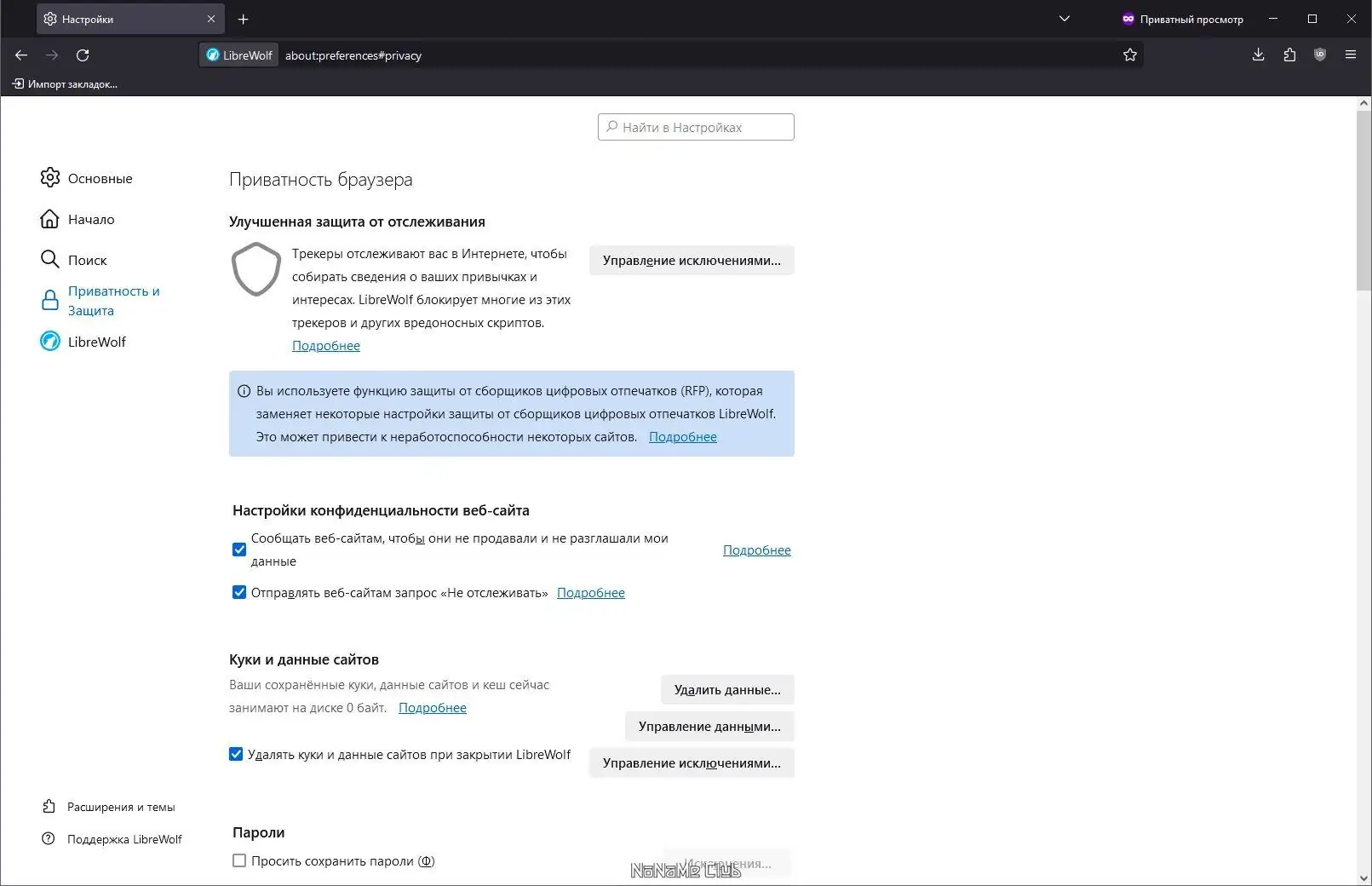 LibreWolf — это форк браузера Firefox, ориентированный на максимальную приватность и безопасность. Он поставляется с предустановленными настройками, отключающими телеметрию, блокирующими рекламу и защиту от отслеживания. Браузер не требует дополнительной настройки и готов к использованию сразу после установки.