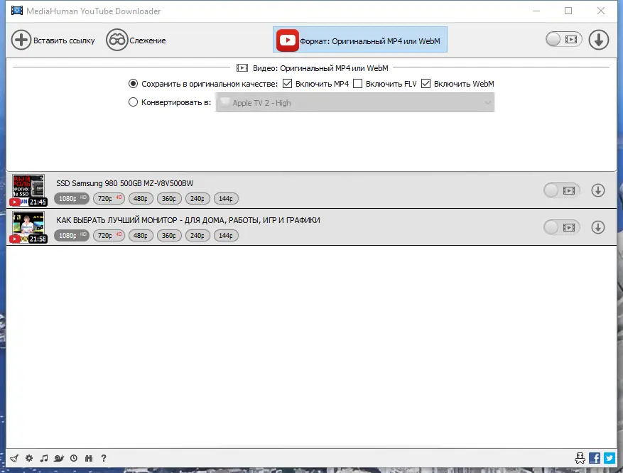 Программа сохраняет оригинальное качество контента, позволяя загружать видео без потерь и конвертировать в нужный формат.