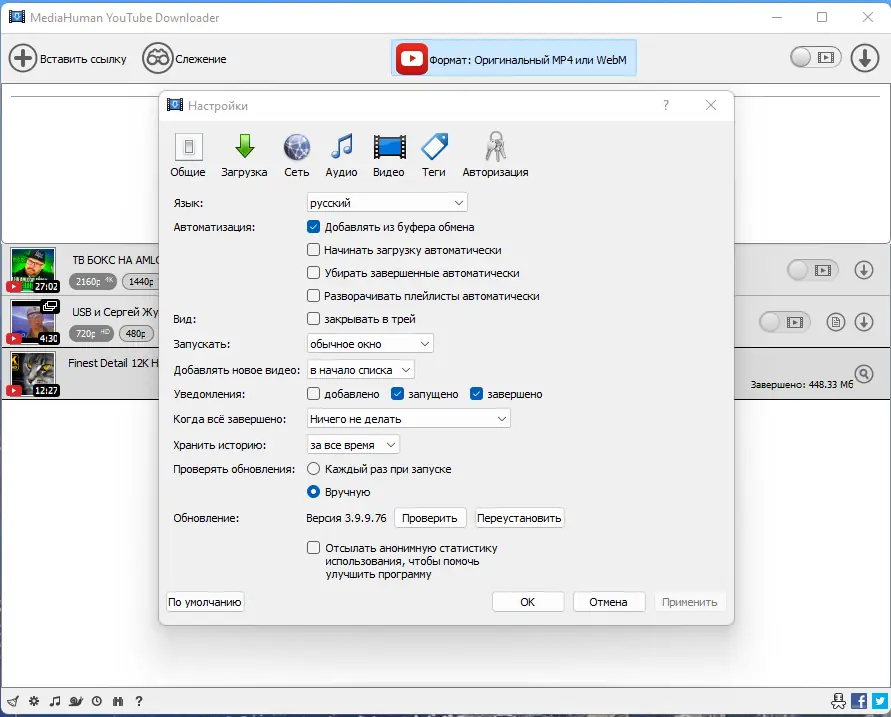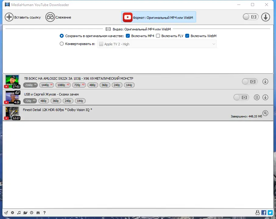- Скачивание в оригинальном качестве без потерь и перекодирования при необходимости