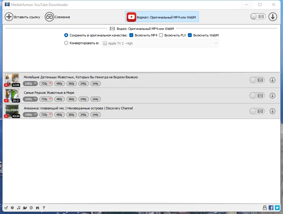MediaHuman YouTube Downloader — удобное приложение для загрузки видео и аудио с YouTube и других платформ. Программа поддерживает высокие разрешения, включая 4K и 8K, а также позволяет сохранять плейлисты и каналы целиком. Вы можете использовать её для оффлайн-просмотра или извлечения звуковых дорожек.