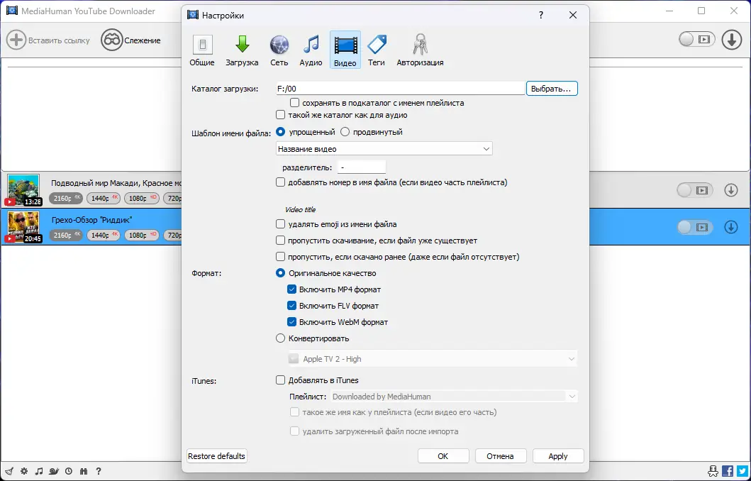 - Возможность автоматического добавления скачанных треков в iTunes или Music.app.