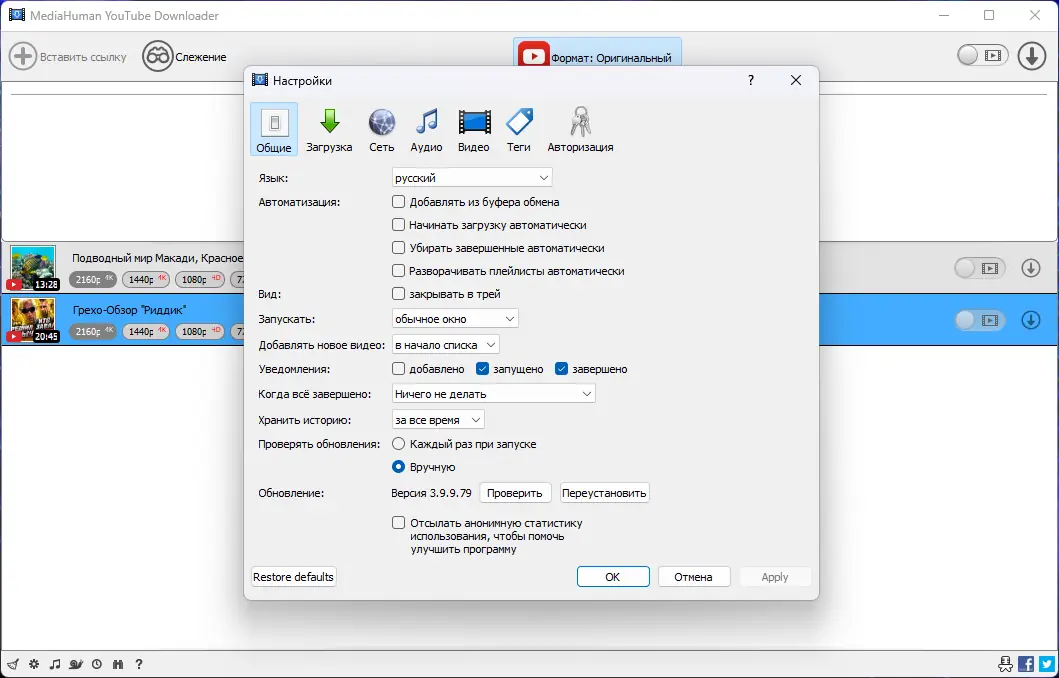 MediaHuman YouTube Downloader — это удобное приложение для скачивания видео и аудио с YouTube и других популярных платформ. Программа поддерживает высокие разрешения, включая 4K и 8K, а также позволяет сохранять только звуковую дорожку. С её помощью можно быстро загрузить отдельное видео, целый плейлист или подписаться на канал с автоматической выгрузкой новых роликов.