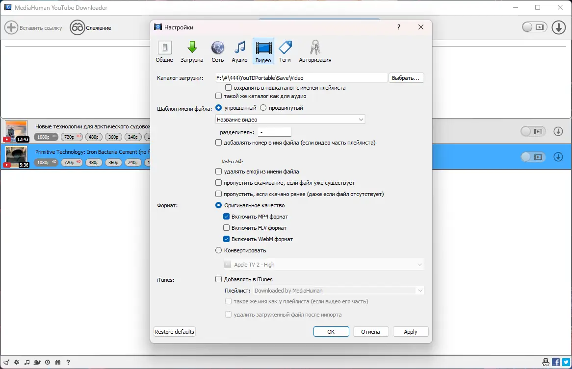 - Возможность загрузки целых плейлистов и каналов, включая автоматическое обновление новых роликов.