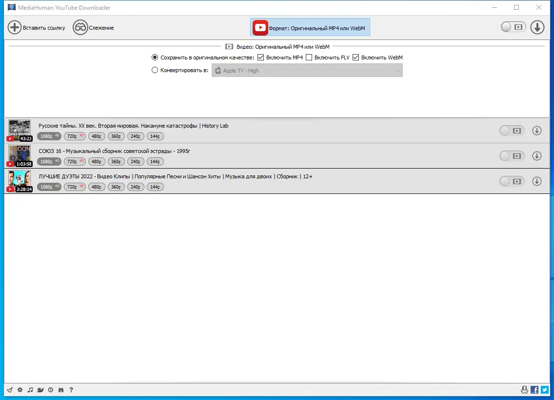 Программа предназначена для пользователей, которым необходимо сохранять контент из интернета для оффлайн-просмотра или прослушивания. MediaHuman YouTube Downloader поддерживает широкий спектр ресурсов, включая YouTube, Vimeo, Dailymotion, Rutube, Facebook, ВКонтакте и SoundCloud. Это делает её универсальным решением для тех, кто активно использует разные видеосервисы. Интерфейс интуитивно понятен, а процесс загрузки максимально автоматизирован.