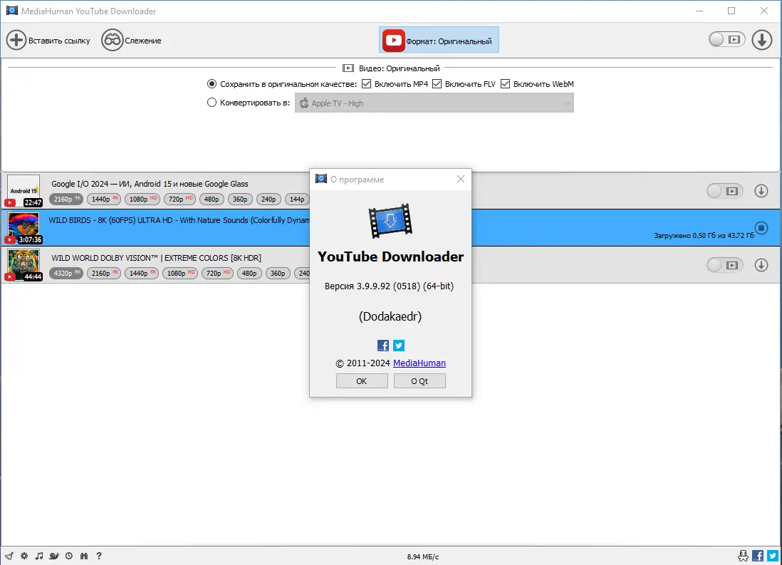 MediaHuman YouTube Downloader — это универсальное решение для тех, кто хочет сохранять видеоконтент с популярных онлайн-платформ. Программа поддерживает не только YouTube, но и такие сервисы, как Vimeo, Rutube, Dailymotion, ВКонтакте, SoundCloud, Odysee и многие другие. Благодаря интуитивному интерфейсу и широкому функционалу, загрузка видео становится простой и быстрой задачей. Пользователь может выбрать нужное разрешение — от 720p до 8K, включая поддержку 60 fps, а также решить, сохранять ли полное видео или только аудиодорожку.