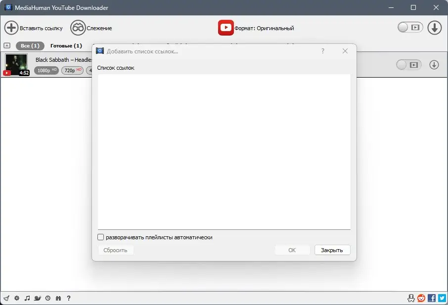 - Автоматическое определение ссылок в буфере обмена и добавление в очередь