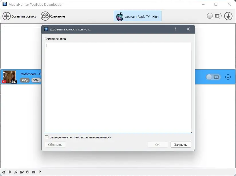 Использование приложения не требует технических навыков. Достаточно скопировать ссылку на видео или плейлист и вставить её в интерфейс программы — загрузка начнётся автоматически. Также доступен способ drag&drop: просто перетащите ссылку с браузера на окно программы или иконку в доке. При включённой функции слежения за буфером обмена приложение само распознает подходящие ссылки и добавит их в очередь.