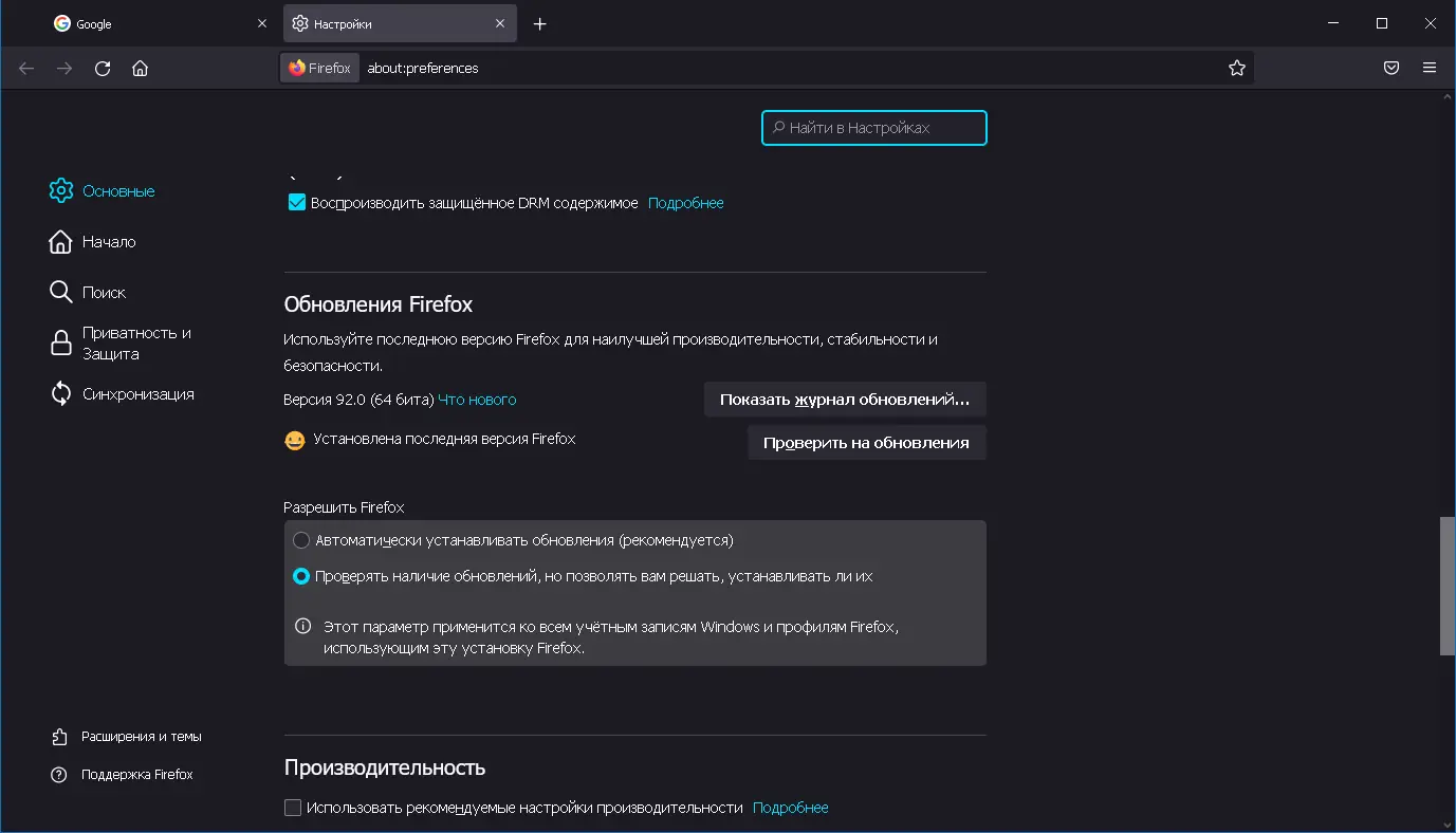 - По умолчанию установлен поисковик Google, а стартовая страница также настроена на его использование.