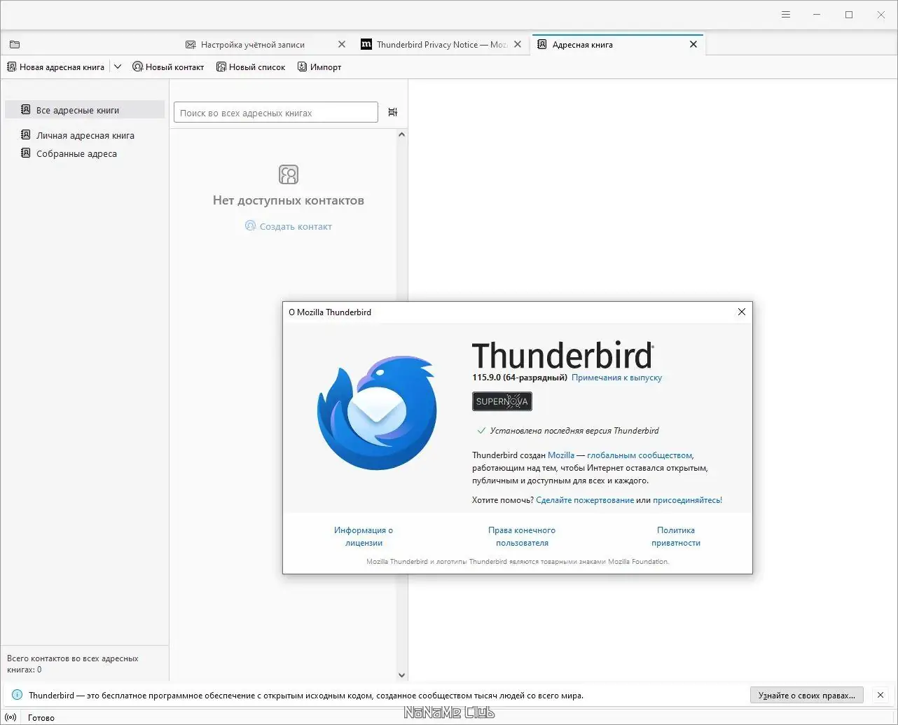 Последняя версия Mozilla Thunderbird доступна для скачивания бесплатно на официальном сайте. Программа совместима с современными операционными системами, включая Windows. Установка проходит быстро, а интерфейс автоматически отображается на русском языке, что упрощает использование для русскоязычных пользователей. Thunderbird остаётся одним из самых надёжных решений для управления почтой, сочетающим в себе безопасность, функциональность и открытость исходного кода.