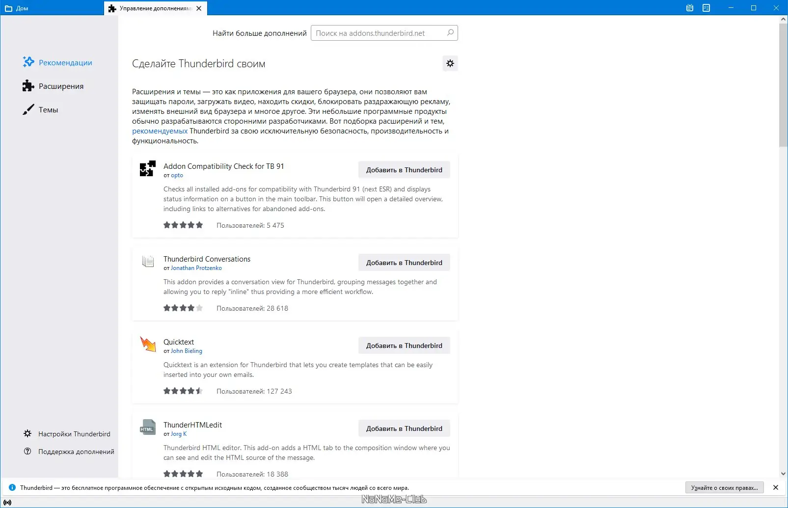 Последняя версия Mozilla Thunderbird доступна для установки на компьютеры под управлением Windows. Программа распространяется бесплатно и не содержит рекламы или вредоносных компонентов. Её можно скачать бесплатно с официального сайта, что гарантирует получение актуальной версии с поддержкой русского языка и всеми актуальными исправлениями безопасности. Thunderbird подходит для windows 7, 8.1, 10 и 11, работая как на 32-, так и на 64-битных системах. Благодаря открытому исходному коду, каждый пользователь может быть уверен в прозрачности и безопасности приложения при работе с личной почтой.